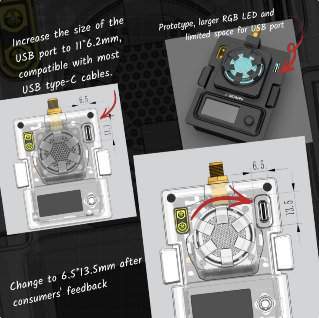 As you know, we really care about all of our customers' opinions, thoughts, and experience of our products, as you all are like treasure that makes us become better. For anyone who has bought this module and not compatible with your own USB cable, we will send you a free USB Type-C cable that fits this module or a new version case with larger USB Type-C port housing space (13.5*6.5mm). (Please email our support team to claim for the cable or a new case: support@betafpv.com).