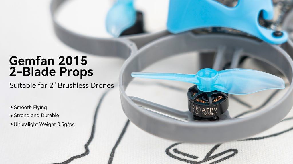 Gain more power, control, and speed with Gemfan Durable 2015 2-Blade Propellers! These 2" two-blade propellers will bring you to a new level of smooth flying. These props are made of thin PC material, and the two-blade design can provide your quadcopter with strong power off the ground. Perfect for any 2" quads and suitable for BETAFPV 1103 Brushless Motors.