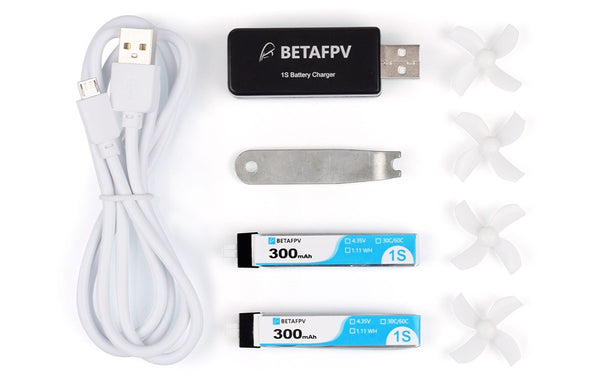 Provided 2 PH2.0 300mAh 1S 30C Batteries, 1 USB Charging Cable, PH2.0 Battery Charger & Tester, super portable for charging. What's more, the Batteries, USB charger, and Spare parts for easy repairs. We also provided 4 props and 1 prop removal tool, convenient to exchange the props.