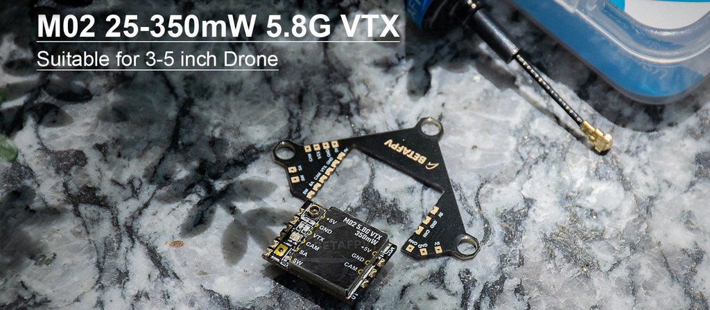 M02 5.8G VTX board is a high-quality 5.8GHz VTX has 4 adjustable power including 25mW, 100mW, 200mW and 350mW. With 350mW output power, pilots can fly drones up to 600 meters away to explore more possibilities and fun.