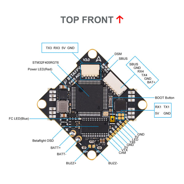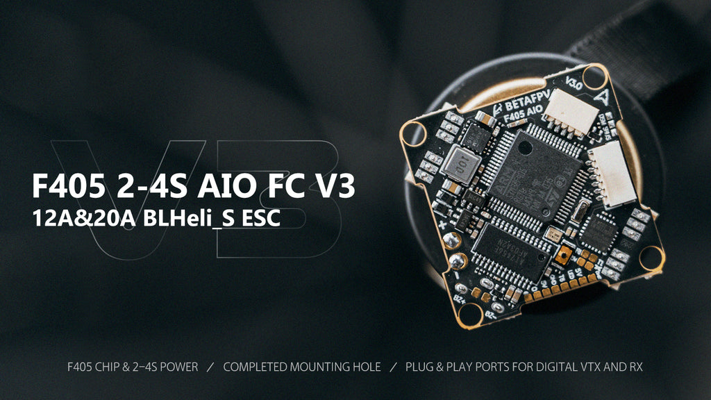 F405 2-4S AIO 12A Brushless Flight Controller (BLHeli_S) V3 has been updated the F411 chip to F405, which can totally handle 12A continuous current(13A burst), gives pilots a powerful flight. Highly recommended using it on Beta75X series drone, Beta85X series drone and HX100 series drone such as Beta85X V2 and Beta85X HD Digital VTX.