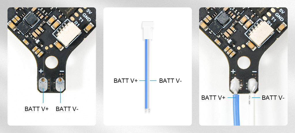 The BT2.0 U Cable Pigtail and the BT2.0 1S Whoop Cable Pigtail are composed of blue wire and white wire. The blue wire is the positive pole(+), and the white wire is the negative pole(-). When you resold your board, please pay attention to the connection method.