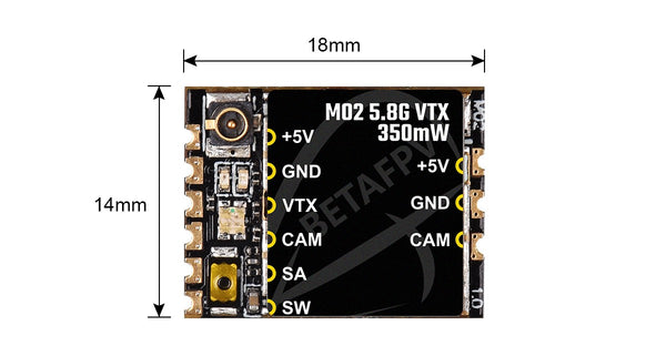 - With the 350mW output power, M02 VTX provides a stable image and strong transmission. Pilots can fly drones up to 600 meters away.