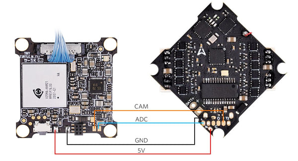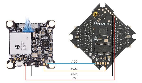 You need to configure your FC before you could use this function. Use the connection diagram with BETAFPV 1-2S FC (SPI Frsky Version) for example. First check the connection diagram below, the ADC pad is connected with the LED pad on the FC board. So you need enter the CLI commands via the Betaflight Configuration.