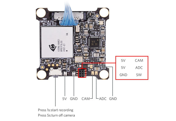 As usual, we use the 5V, GND and CAM pads for most of the function. For option, if you want to change the configuration of the camera, there are some modification needed. Remove the 6-pins black connector and use the ADC pad.