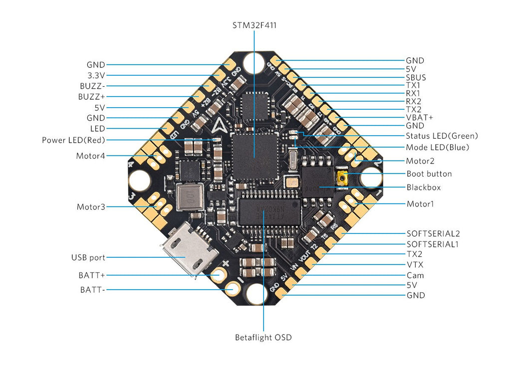 • Support BLheli/BLHELI_S suite Pass-through ready