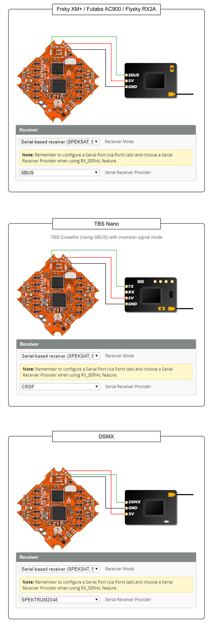 - Receiver: Support external SBUS/DSMX protocol receiver or SPI CC2500 receiver module (compatible with Frsky_D/Frsky_X_FCC/Frsky_X_LBT)