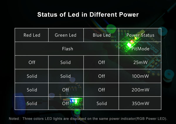 Switchable power includes 25mW, 100mW, 200mW and 350mW, and the PitMode is supported on this VTX.